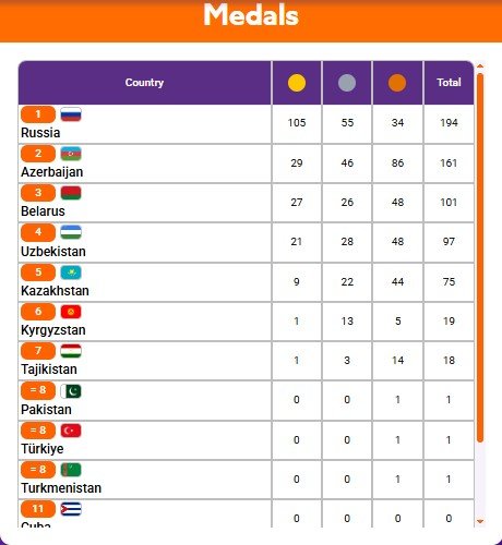 Rusiya 194 (105 qızıl, 55 gümüş, 34 bürünc) medalla birinci, Belarus 101 (27 qızıl, 26 gümüş, 48 bürünc) medalla üçüncüdür.