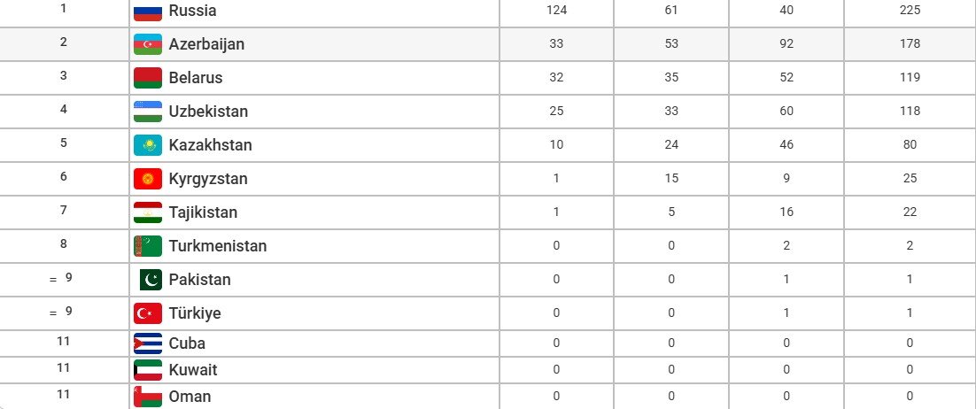 Sıralamada 1-ci yeri 225 (124 qızıl, 61 gümüş, 40 bürünc) medalla Rusiya, 3-cü yeri 119 (32 qızıl, 35 gümüş, 52 bürünc) medalla Belarus tutur.