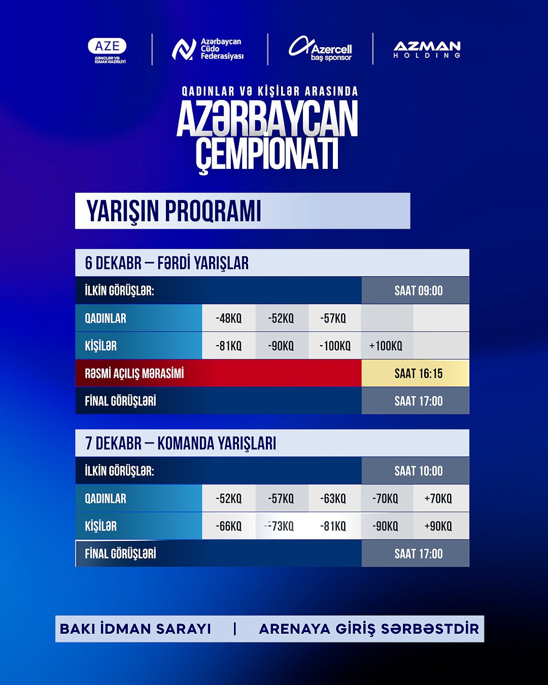 Ölkə çempionatının rəsmi açılış mərasimi 6 dekabr saat 16:15-də baş tutacaq.
