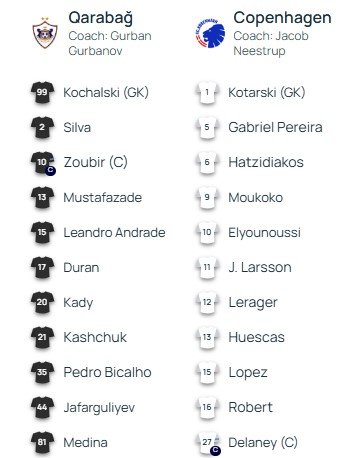"Kopenhagen": 1. Dominik Kotarski, 5. Qabriel Pereyra, 6. Pantelis Hatsidiakos, 9. Yussufa Mukoko, 10. Məhəmməd Elyunussi, 11. Cordan Larsson, 12. Lukas Lerager, 13. Rodriqo Hueskas, 15. Markos Lopes, 16. Robert, 27. Tomas Delani