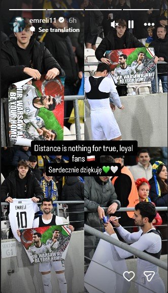 Tribunadakı azarkeşlərə avtoqraf verən Emreli "Sadiq azarkeşlər üçün məsafənin önəmi yoxdur" yazıb. O, fikirlərini polyak dilində "Serdecznie dziekuje" ("Çox sağ olun") sözləri ilə tamamlayıb.