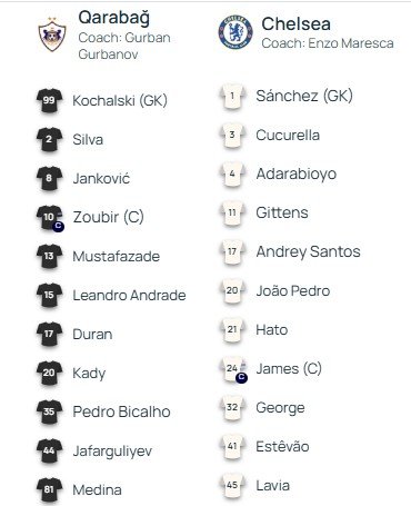 UEFA Çempionlar Liqasında Liqa mərhələsinin IV tur matçında üz-üzə gələcək "Qarabağ" və İngiltərənin "Çelsi" komandalarının start heyətləri açıqlanıb.