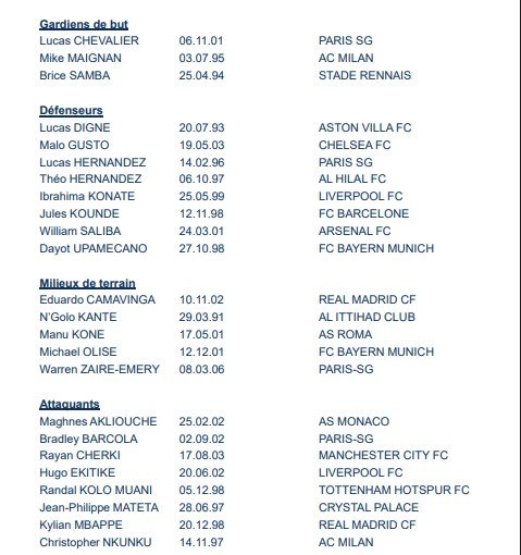 Müdafiəçilər: Lucas Digne, Malo Gusto, Lucas Hernandez, Theo Hernandez, William Saliba, Dayot Upamecano, Ibrahima Konaté, Jules Koundé