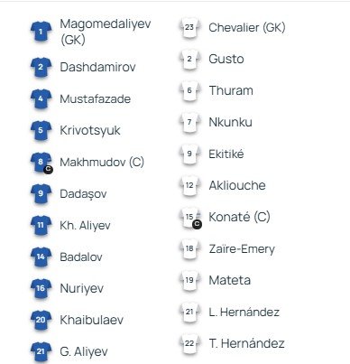 Ehtiyat oyunçular: 1. Bris Samba, 16. Mik Menyan, 3. Luka Din, 4. Dayo Umamekano, 5. Jül Kunde, 8. Floryan Toven, 11. Maykl Olise, 13. Nqolo Kante, 14. Rayan Şerki, 17. Vilyam Saliba, 20. Bradli Barkola