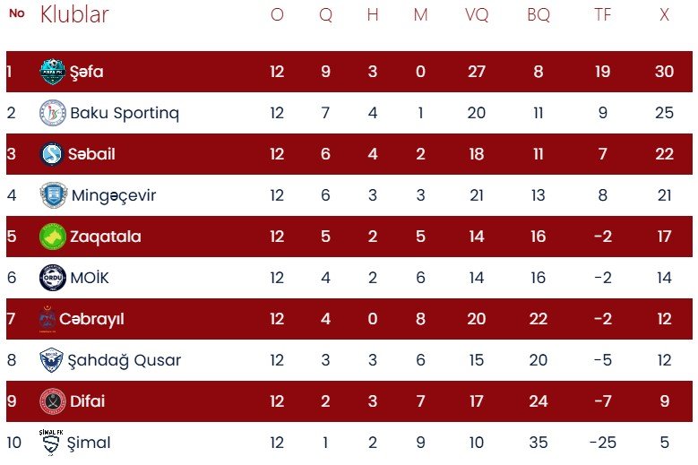 Azərbaycan I Liqasında mövsümün ilk yarısına yekun vurulub.
