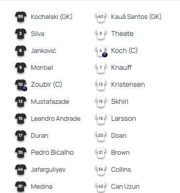 Ehtiyat oyunçular: 23. Mixael Zetterer, 33. Yens Qrahl, 5. Aurele Amenda, 6. Oskar Höylund, 8. Fares Şaibi, 18. Mo Dahud, 19. Jan-Matteo Bahoya, 24. Aurelio Buta, 27. Mario Götse, 41. Fusseni Dumbia, 45. Marvin Dills, 53. Aleksander Staff