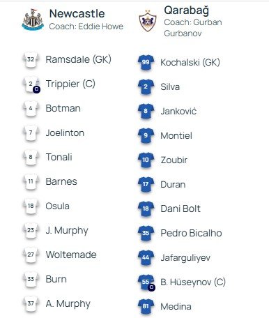 "Nyukasl": 32. Eron Ramzdeyl, 37. Aleks Mörfi, 33. Den Börn, 4. Sven Botman, 2. Kiran Trippye (kap.), 7. Joelinton, 8. Sandro Tonali, 27. Nik Voltemade, 11. Harvi Barns, 18. Uilyam Osula, 23. Ceykob Mörfi