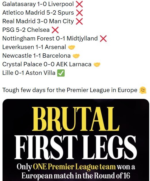 Beləliklə, Avropada çıxış edən doqquz İngiltərə klubundan yalnız biri qalib gəlib, üçü heç-heçə edib, beşi isə məğlub olub. Bu nəticələr İngiltərə Premyer Liqası təmsilçilərinin turnirin bu mərhələsində gözləniləndən xeyli zəif çıxış etdiyini göstərir.