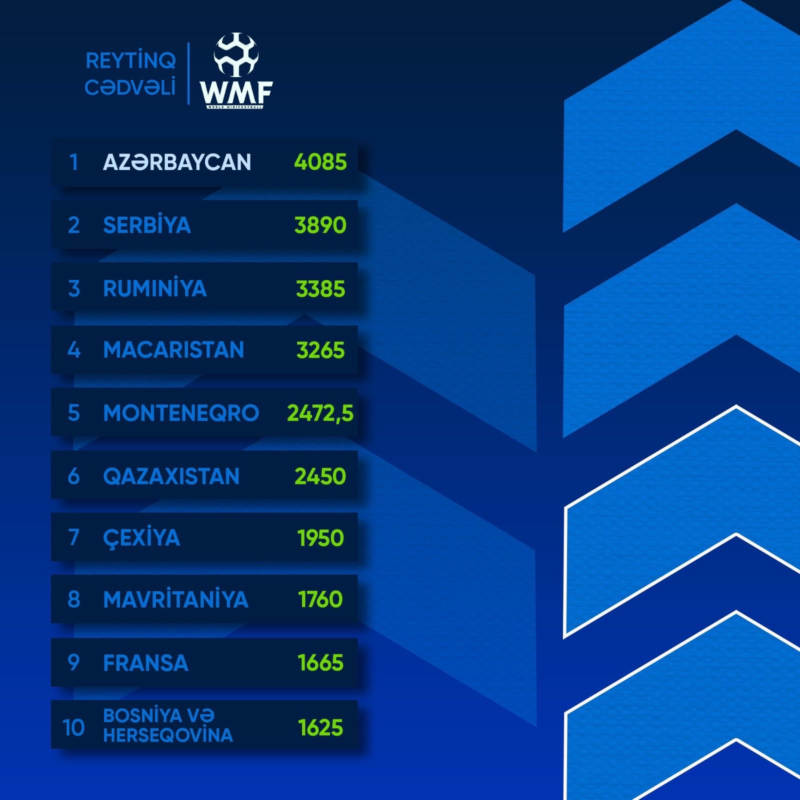 Sportnet.az-ın məlumatına görə, Dünya Minifutbol Federasiyası (WMF) milli komandaların yeni reytinq cədvəlini açıqlayıb.