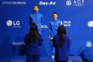 Aerobika gimnastikası üzrə azərbaycanlı favorit cütlük - Mədinə Mustafayeva və Vladimir Dolmatov Avropa çempionu adını qazanaraq 1-ci yerin sahibi olublar.