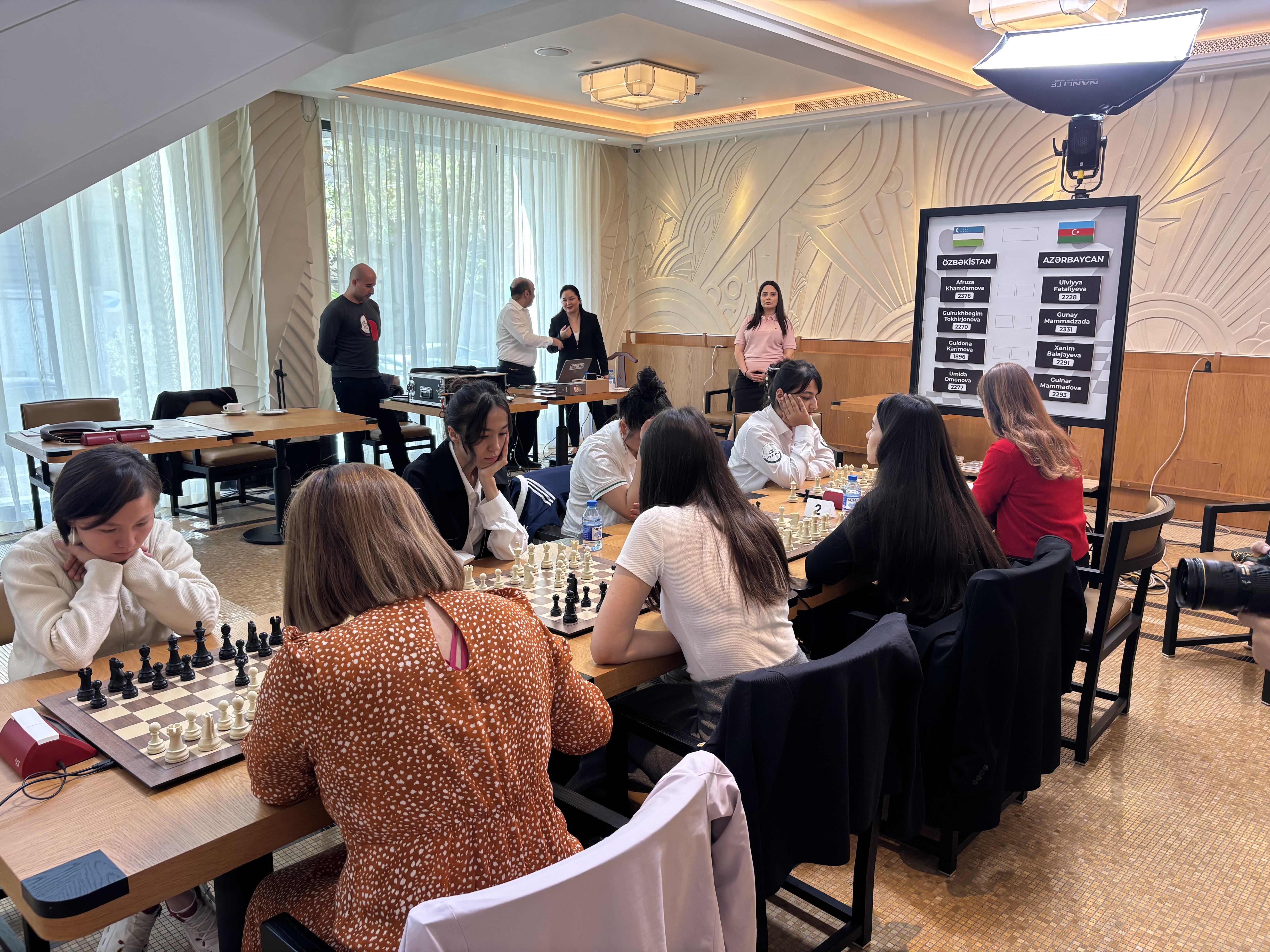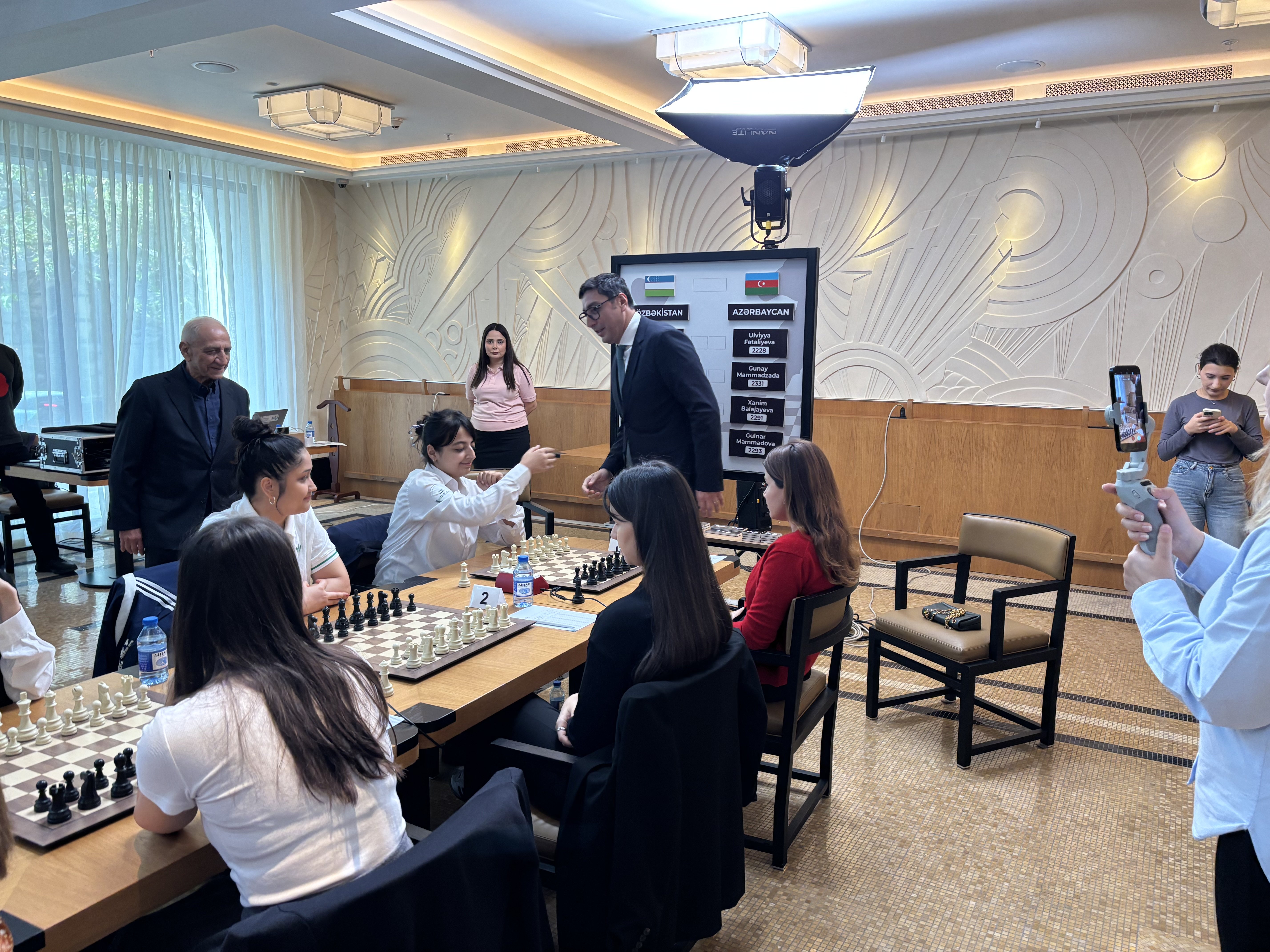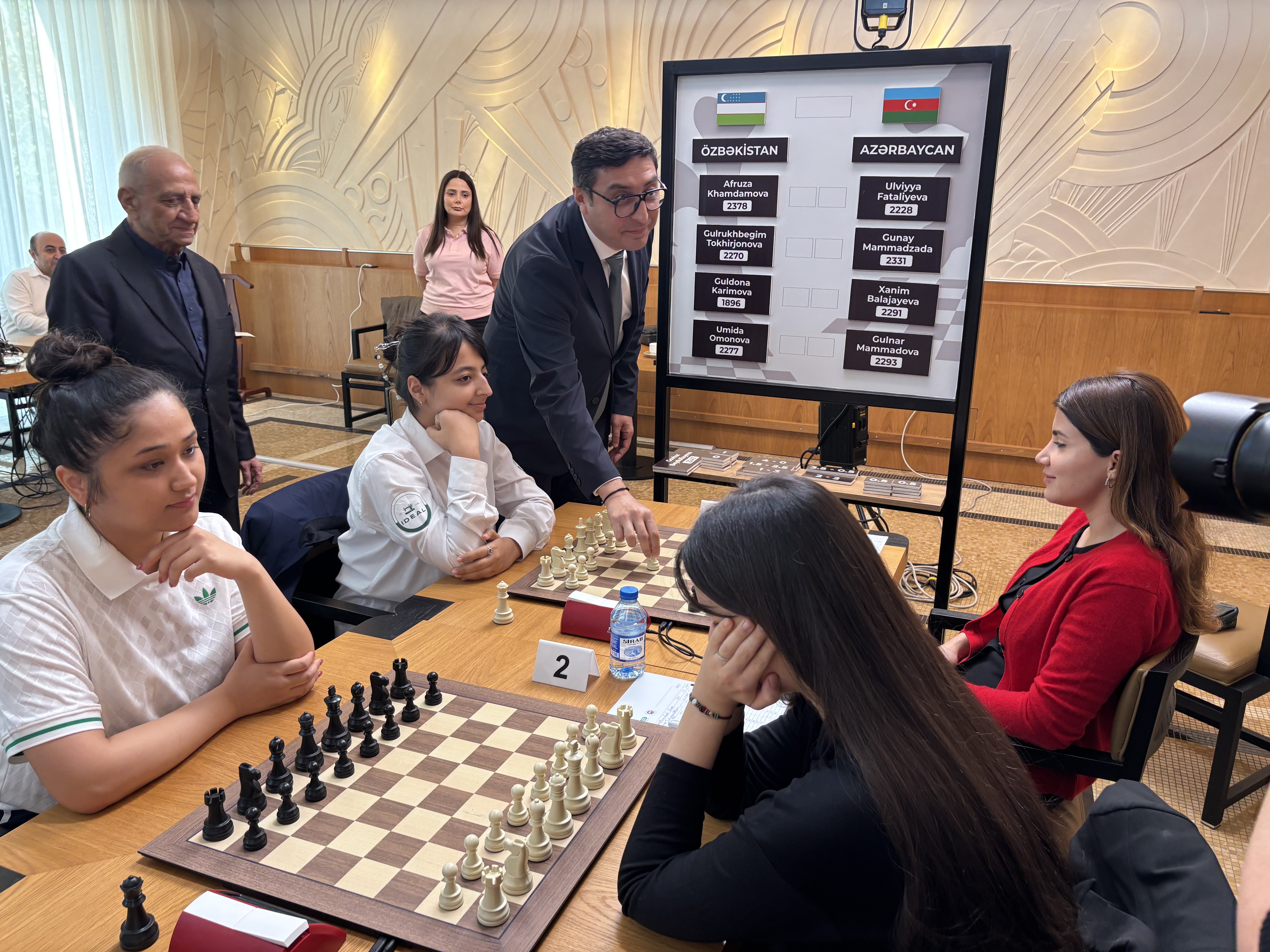 Daha sonra gənclər və idman naziri Fərid Qayıbov, Azərbaycan Şahmat Federasiyasının I vitse-prezidenti Faiq Həsənov yarış iştirakçılarını salamlayıb. Onlar hər iki komandaya uğurlar arzulayıblar.