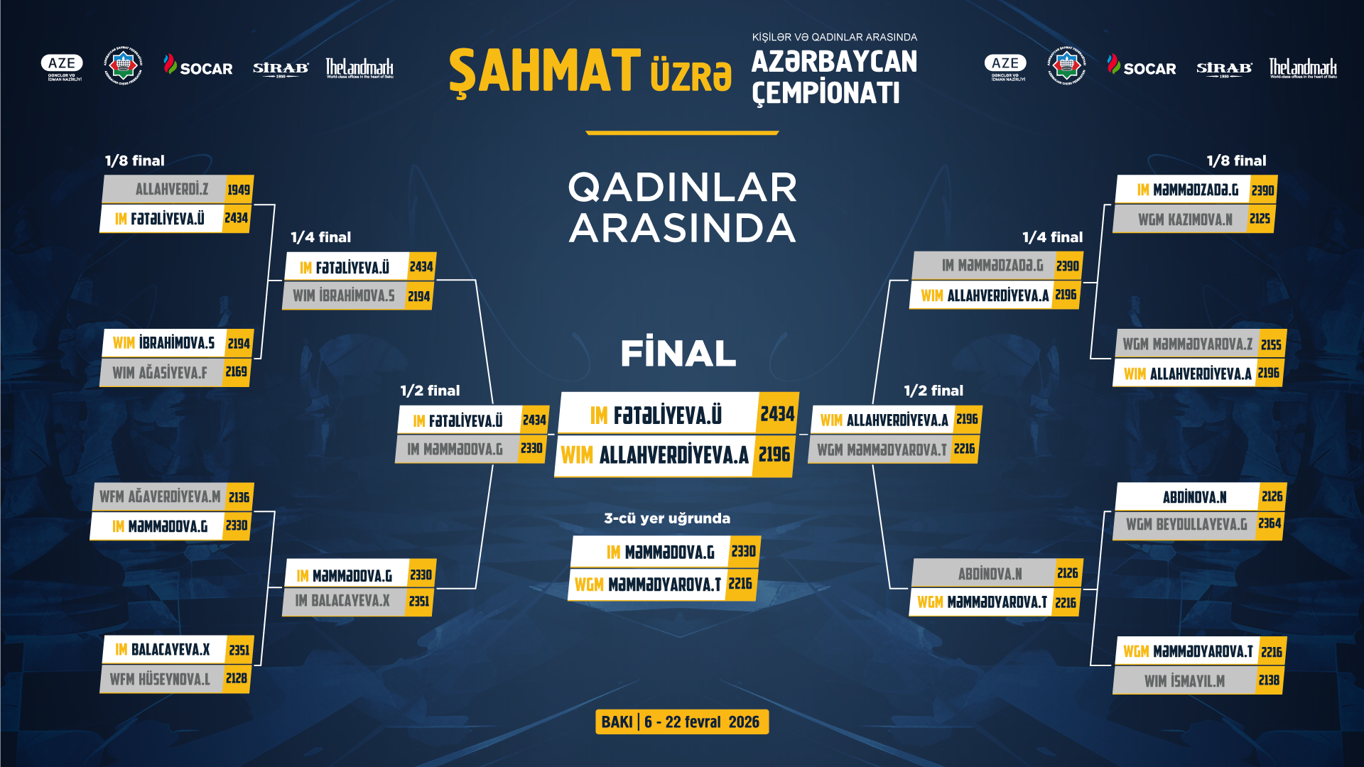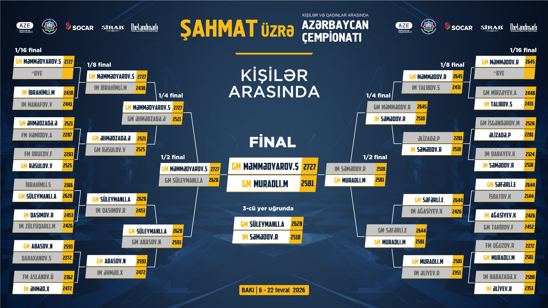 Sportnet.az-ın məlumatına görə, kişilərin yarışında çempionluğun taleyi Məhəmməd Muradlı və Şəhriyar Məmmədyarov arasındakı mübarizədə həll olunacaq.